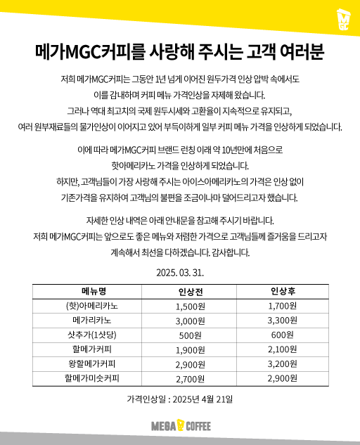 🔍 이 가격 인상은 메가커피 브랜드 출범 이후 10년 만에 첫 인상이라 화제가 되었어요.