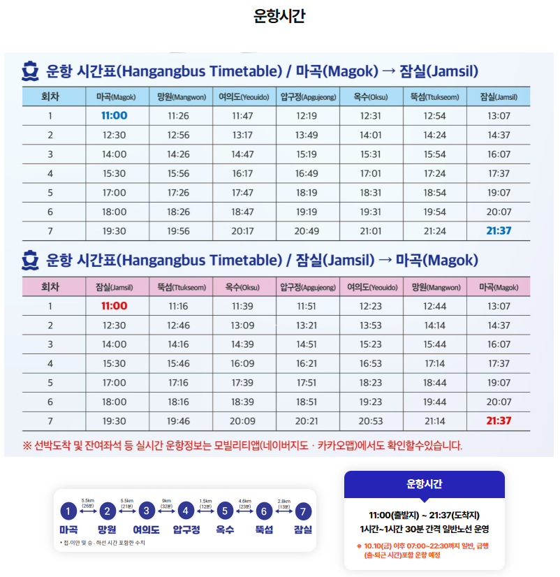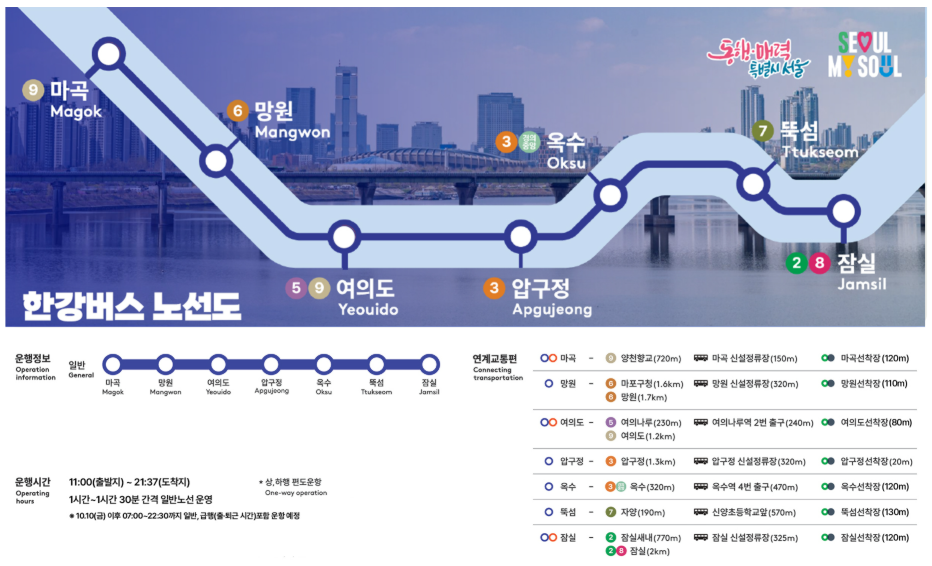 🚢 운행 구간: 마곡 → 망원 → 여의도 → 압구정 → 옥수 → 뚝섬 → 잠실