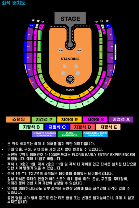스탠딩, 지정석 A~P, 특수존까지 세분화되어 있어요.