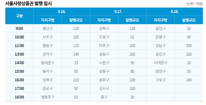 아래 표를 참고해서 원하는 구의 상품권을 꼭 해당 시간에 맞춰 구매하세요! ⏰