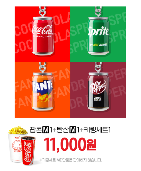 세트는 팝콘 M + 탄산 M + 키링세트(4종) 구성으로 11,000원에 판매돼요.