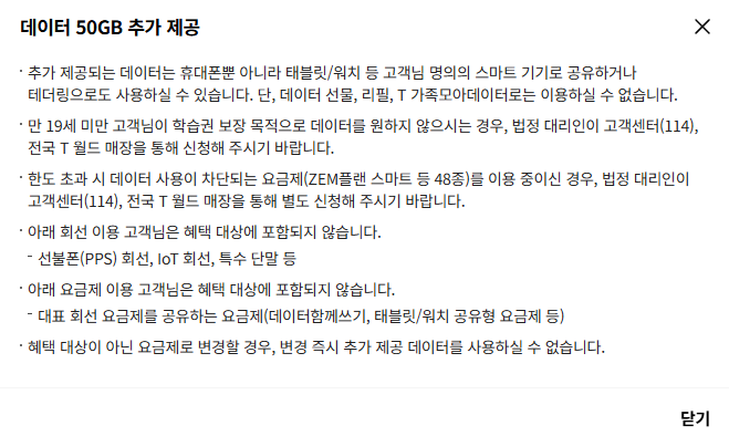 | 데이터 용량 | 월 50GB 추가 지급 |