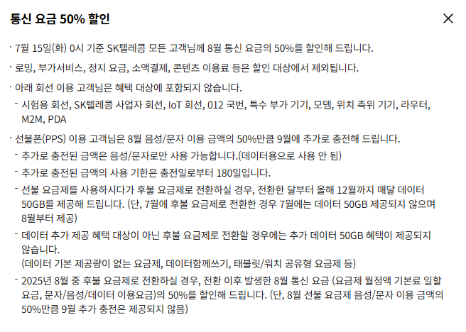 | 할인 내용 | 8월 1개월간 음성·문자·데이터 기본 요금의 50% 할인 |