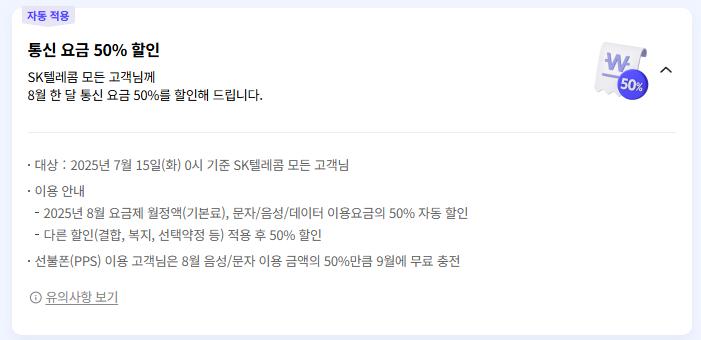 | 통신요금 50% 할인 | 8월 1개월, 자동 적용 |